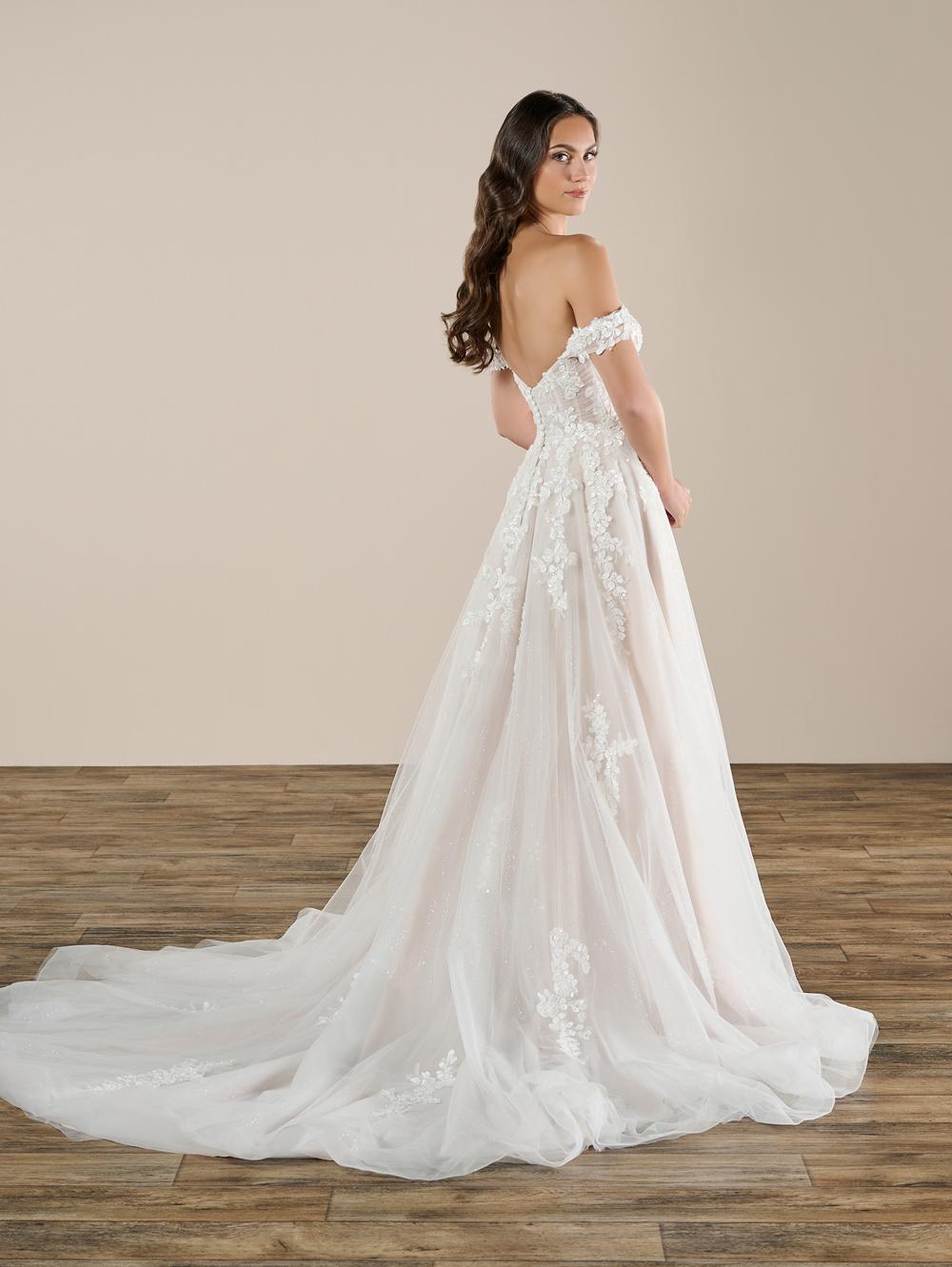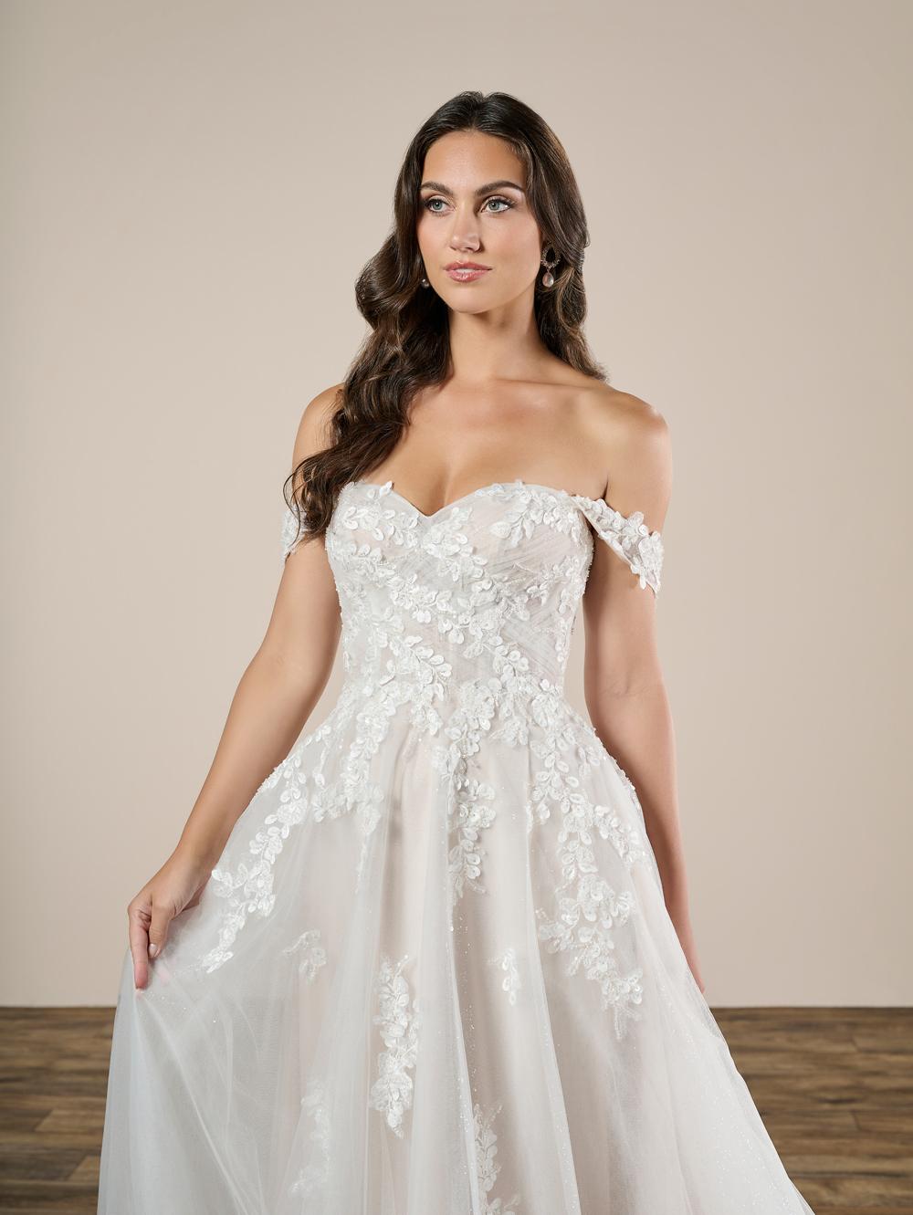 This 2025 is the year for romantic brides, this model combines a soft, flowing tulle, along with a floral pattern lace embroidered with metallic thread details. Off-shoulder sleeves fall subtly to give a classic touch.