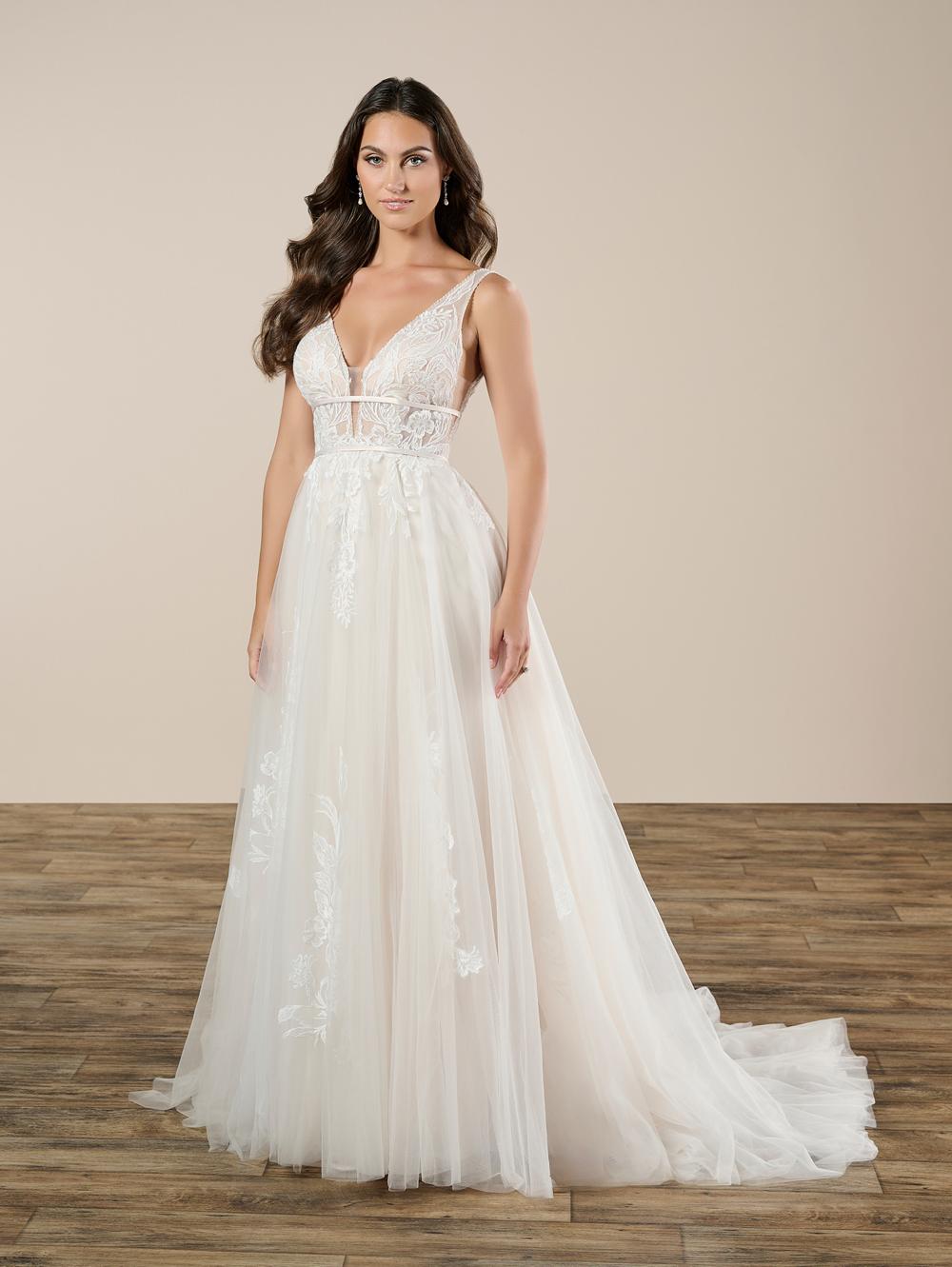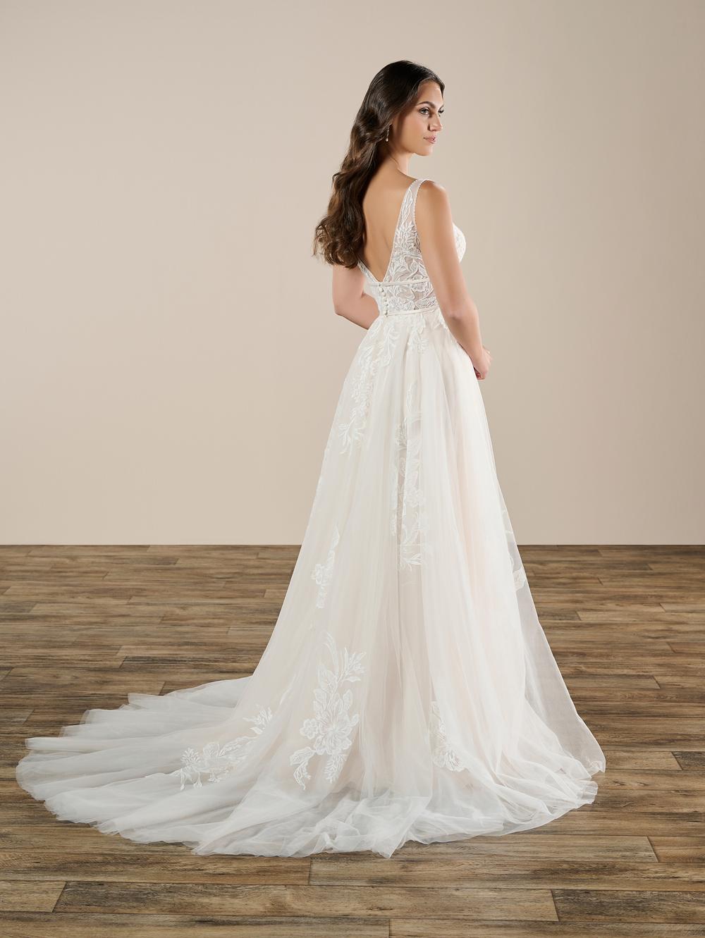 Un delicado corte en V fresco y moderno en este vestido de novia. Una espalda en V que abre paso a una cola catedral. Unas tirillas sutiles enmarcan la cintura para lograr una visual estilizada y moderna.