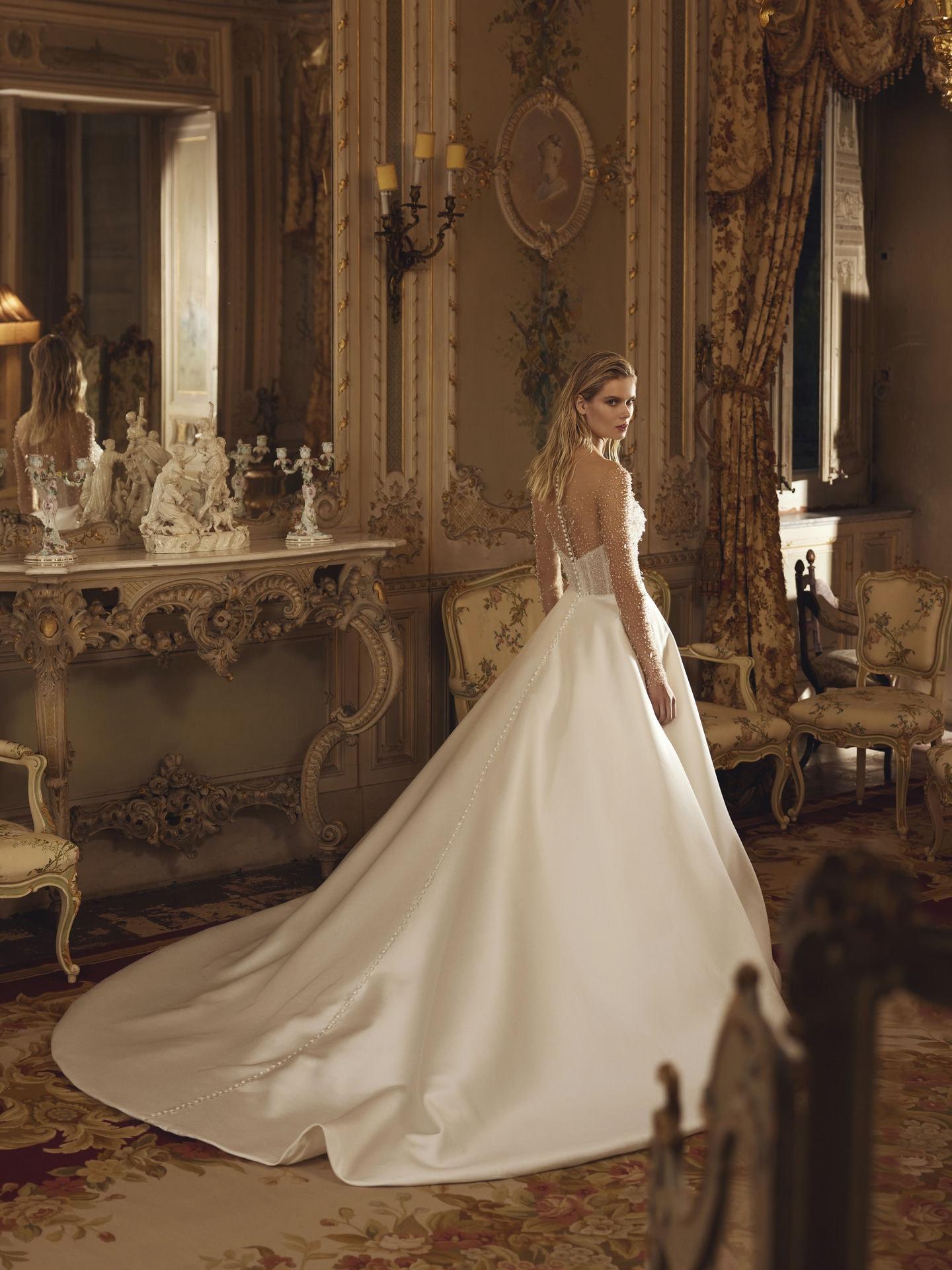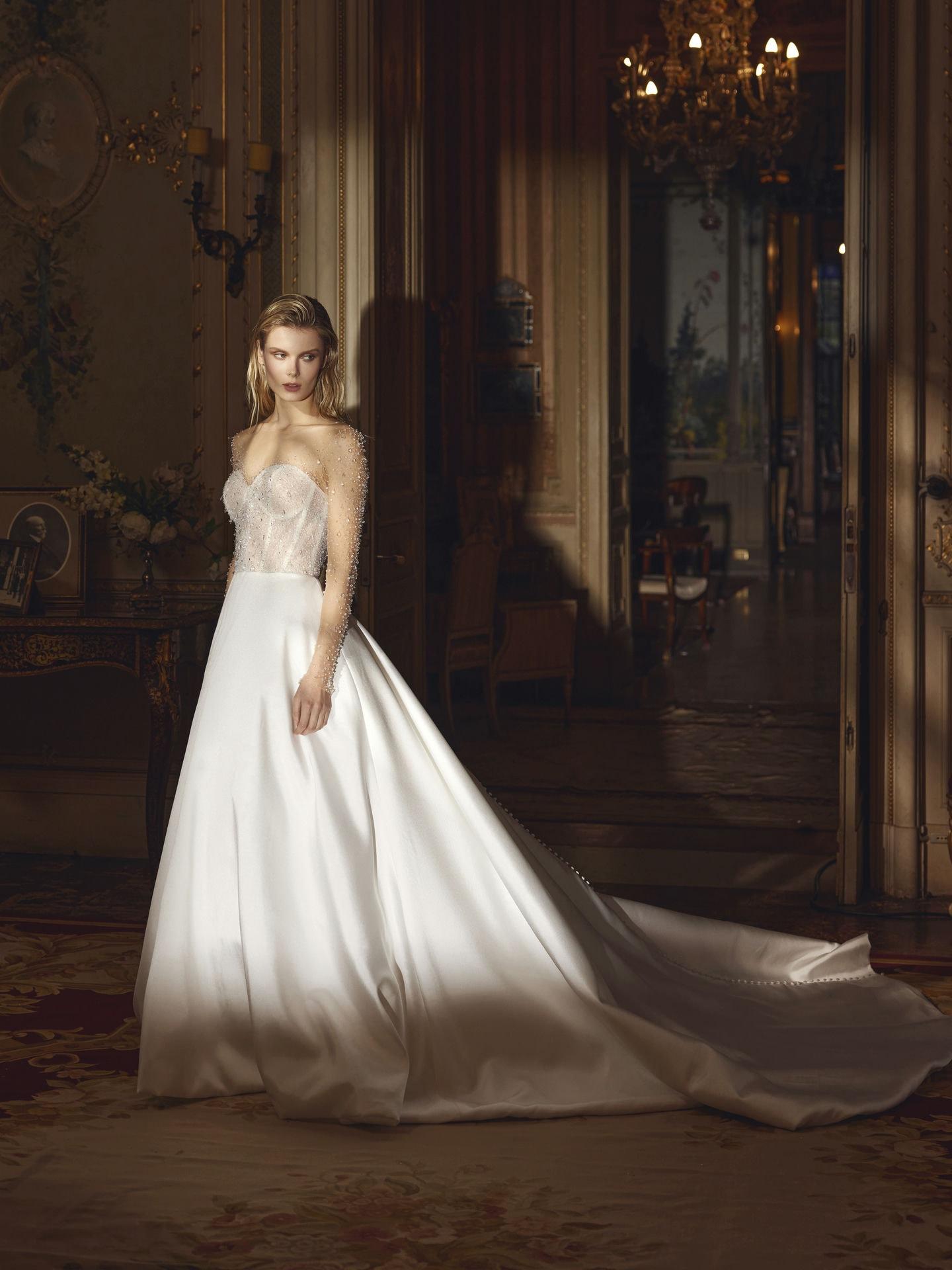 Bridal House with exclusive designs in the Dominican Republic. An elegant and chic princess, with this mikado satin A-line dress. A bodice completely embroidered with swarosky crystals and crystal rhinestones. A luxury dress