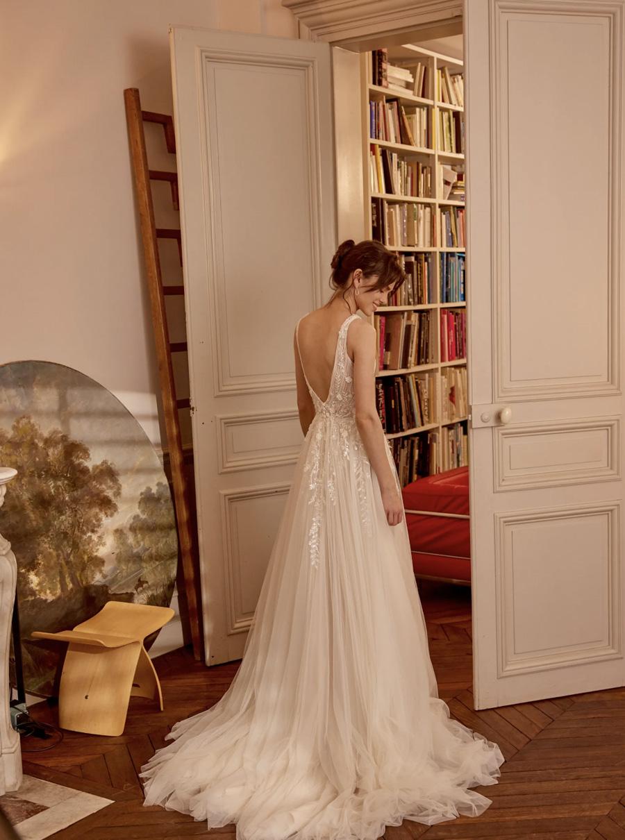 A-line wedding dress with subtle silk tulle. A beautiful neckline that elongates the figure along with a delicate tulle drape superimposed on a layer of shiny lace. A low back creates sensuality