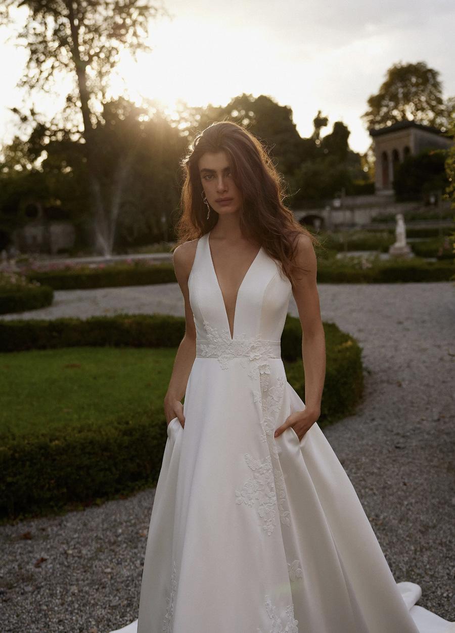 Wedding dress from the exclusive Justin Alexander house, made in exquisite satin mikado. A V-cut at the neckline elongates the figure and a back with a lace design on an illusion tulle is the charm of this dress. 3D floral lace rises on the dress giving the sensation of coming to life.