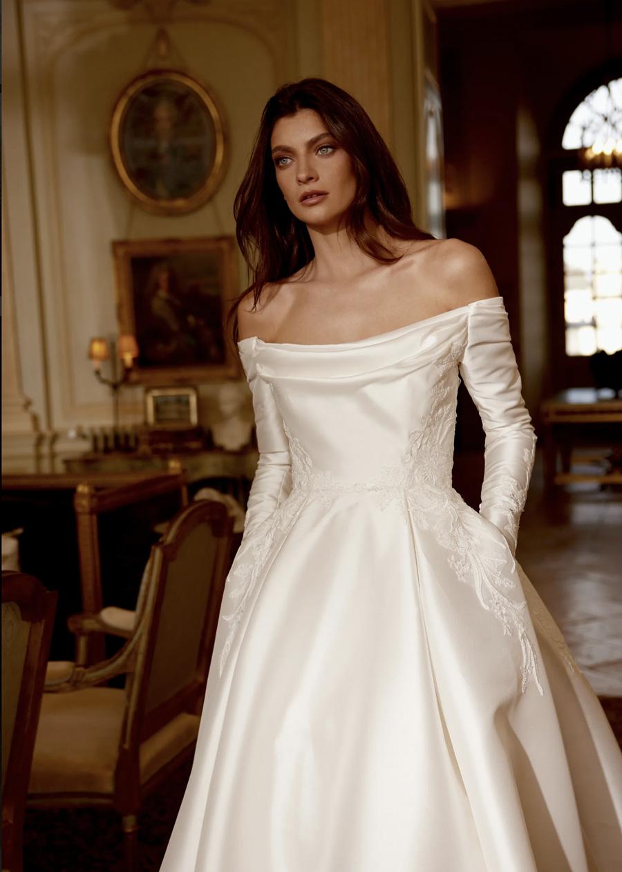 Elegance and class in this Josephine Brides dress, a princess dress with a boat neckline, with draped lines. Smooth and elegant sleeves are a detail of elegance and sophistication. The cathedral train is completed with crystal embroidered lace details. One of our favorite outfits!