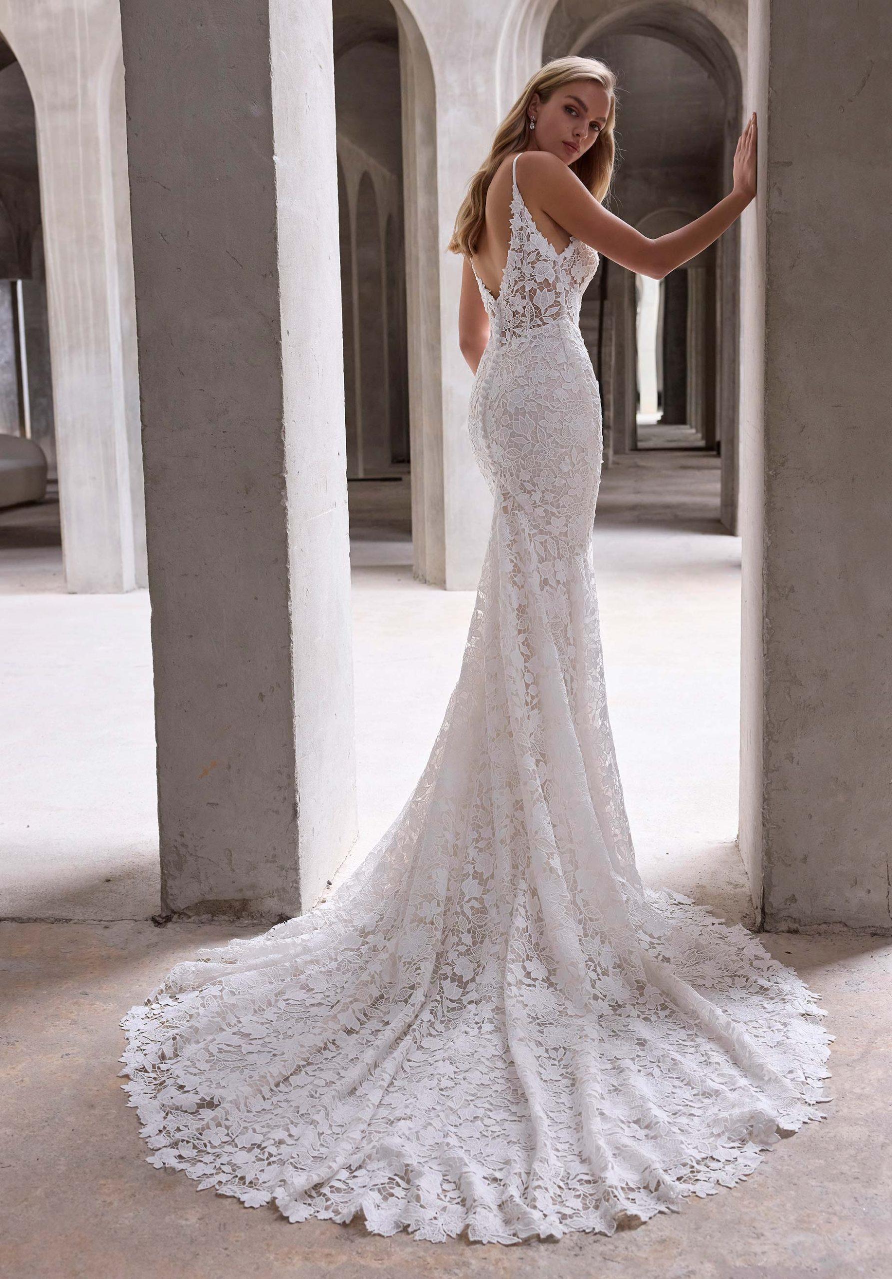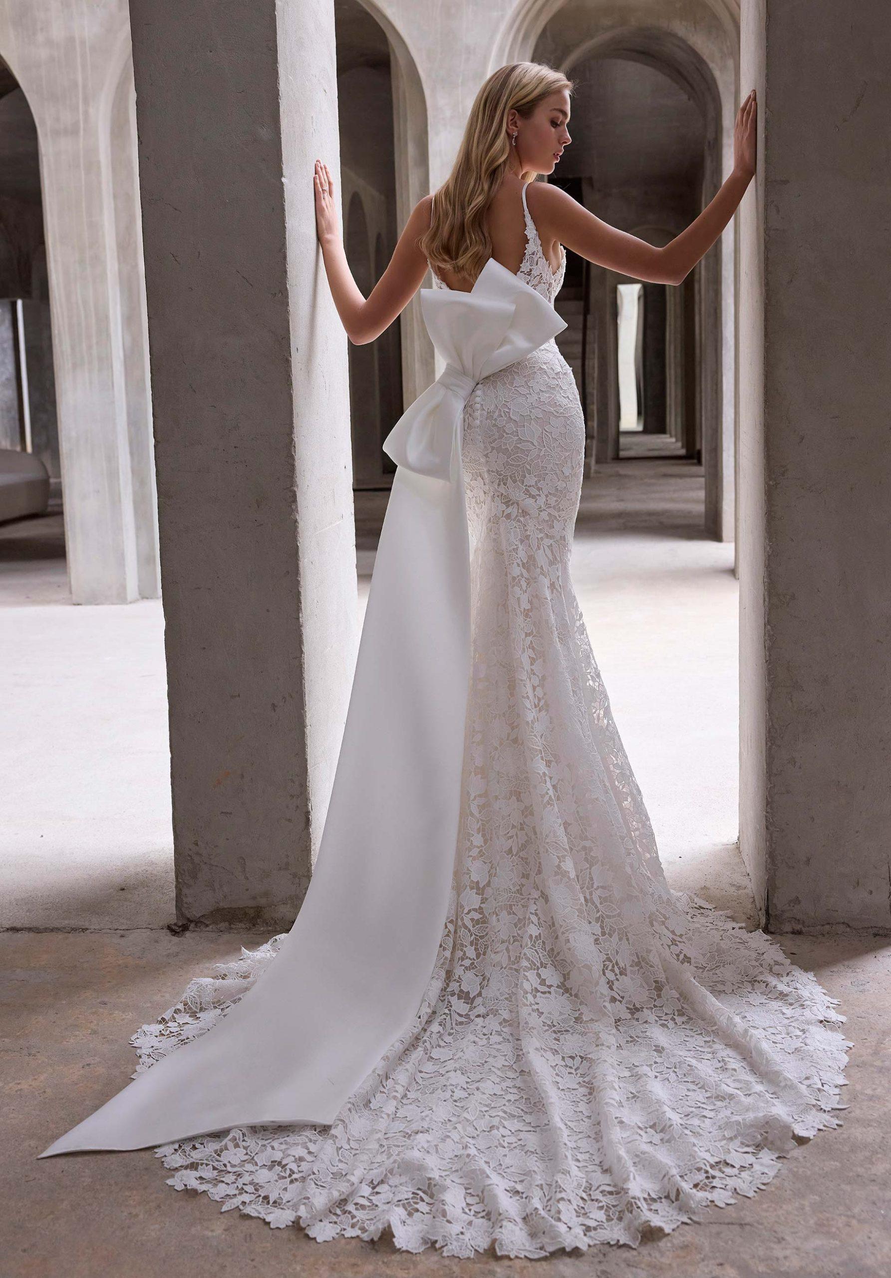 A comfortable, fitted mermaid wedding dress by Gupiera with floral patterns. A sweetheart neckline with bow straps and an open back are elements for a chic and sophisticated bride. A large bow at the lower back creates a stunning statement.