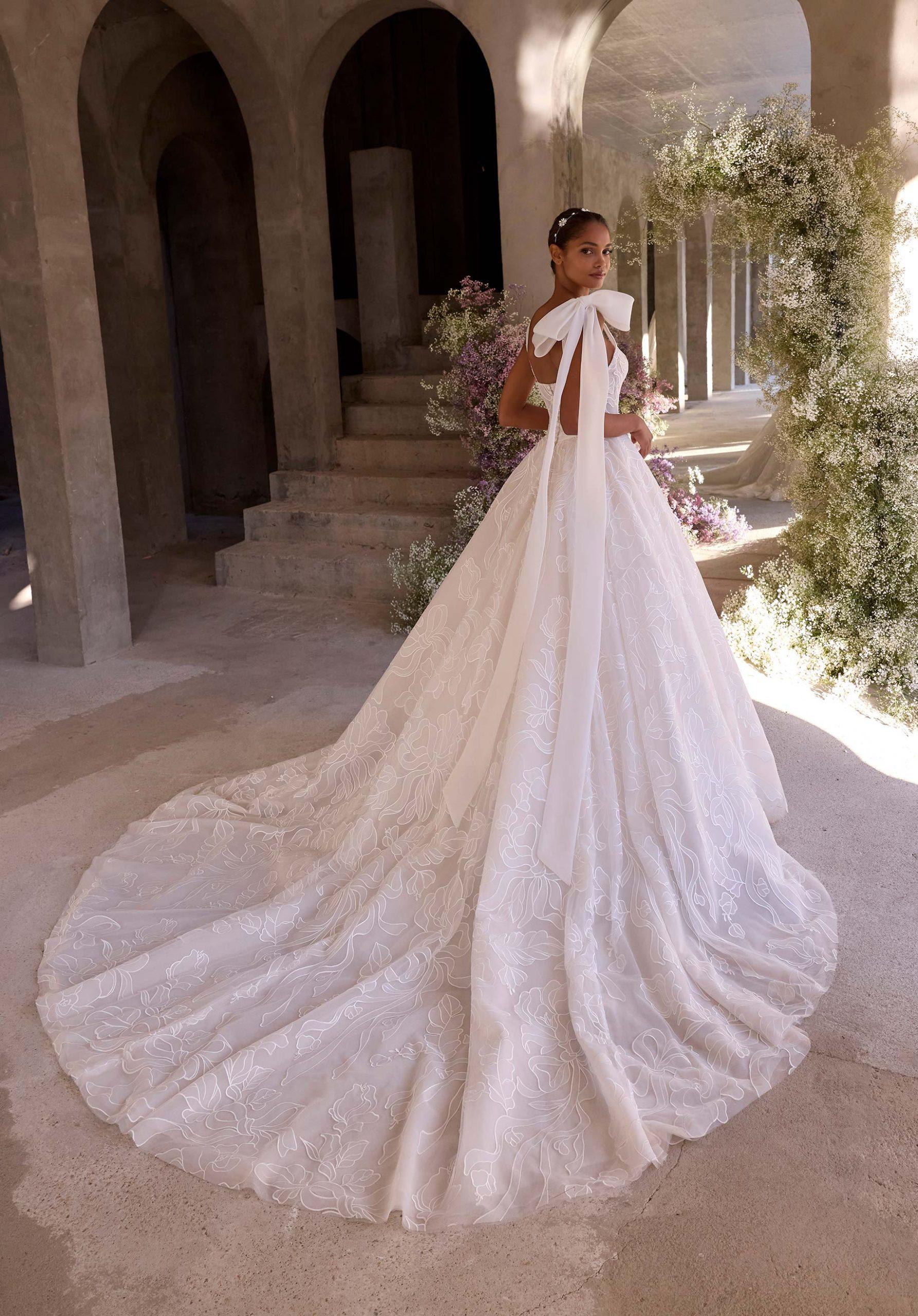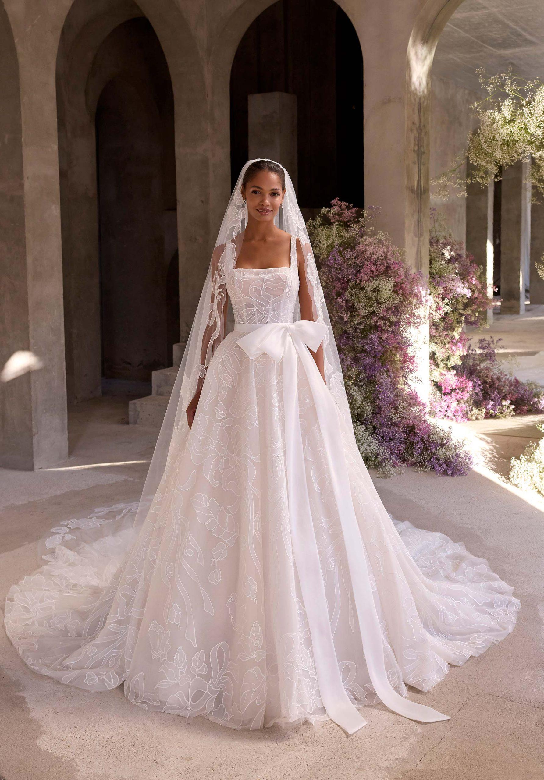 The princess wedding dress features organza embroidered details, an elegant and exquisite floral design embroidered on tulle revealing a sheer layer, allowing for a spectacular play of light. A square neckline and a satin waistband accentuate the waist are delicate and subtle details.
