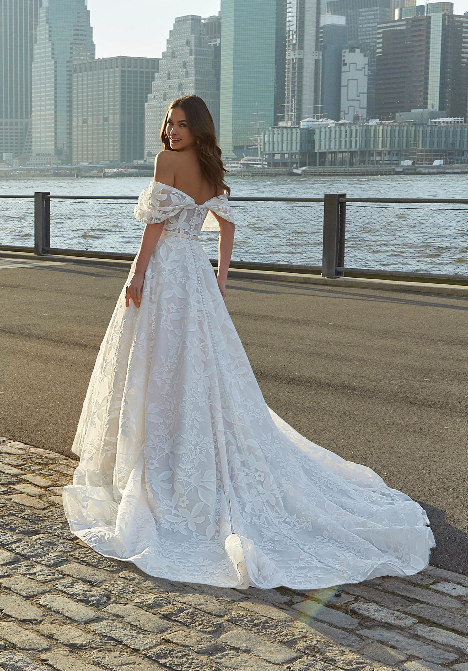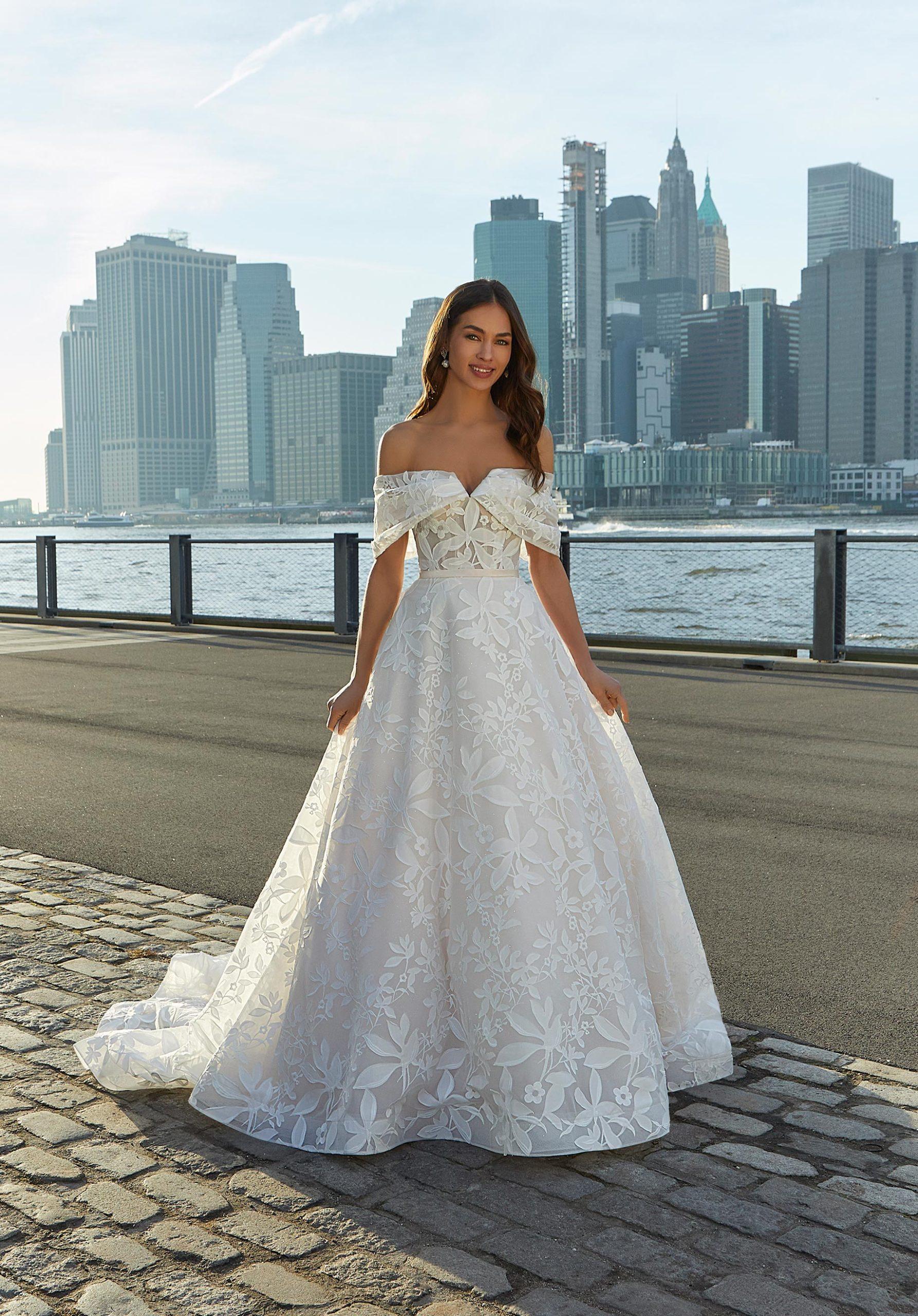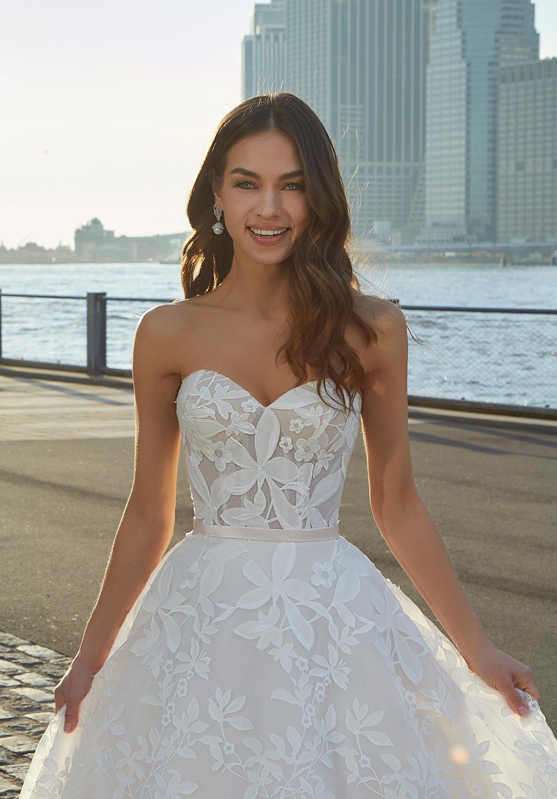 A-line wedding dress. A pattern made and created for this dress. Overlapping pieces in floral patterns create a magical garden. A waistband accentuates the figure. A strapless heart cut that then includes off-shoulder sleeves creates the 2-in-1 effect that every bride is looking for….