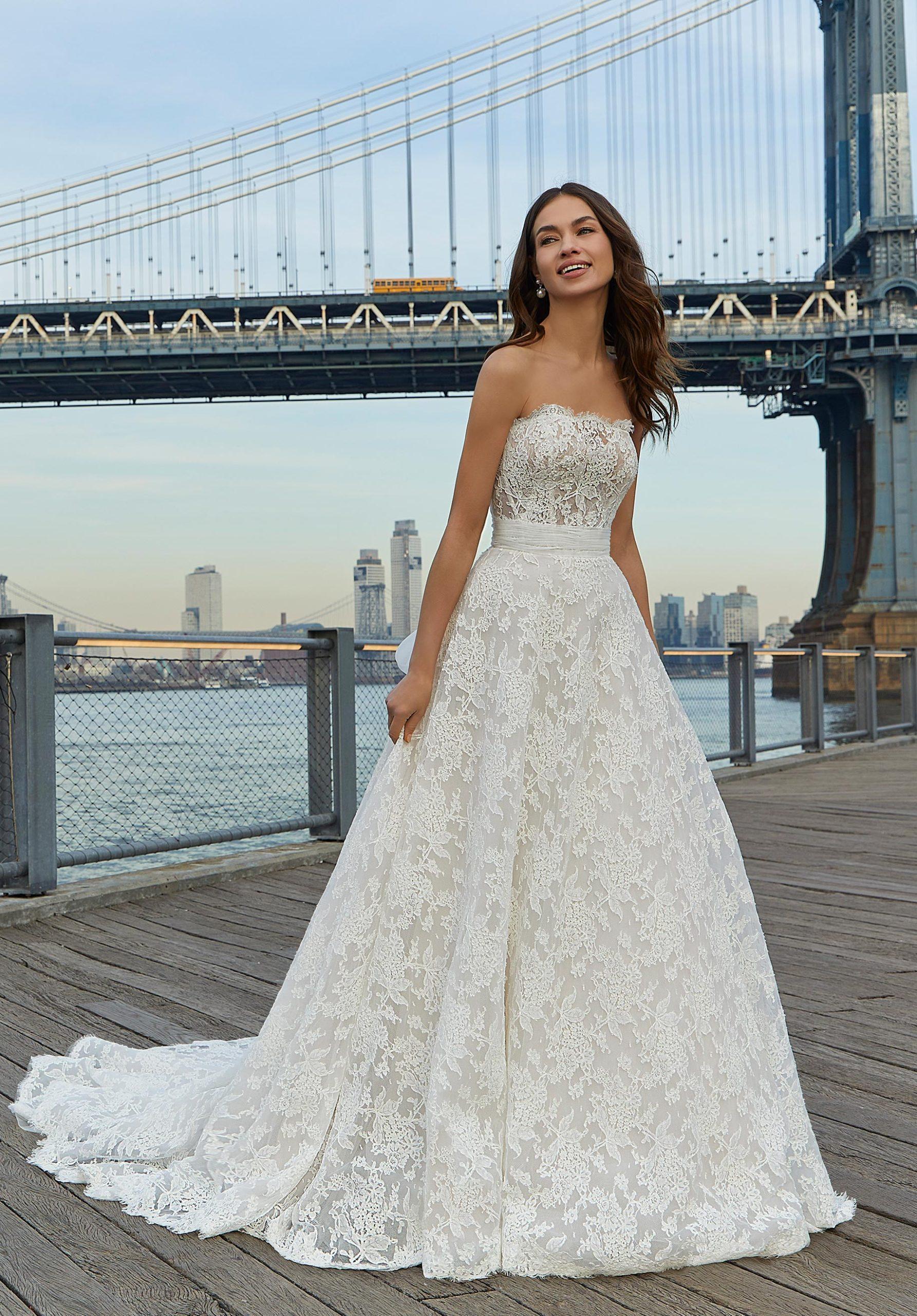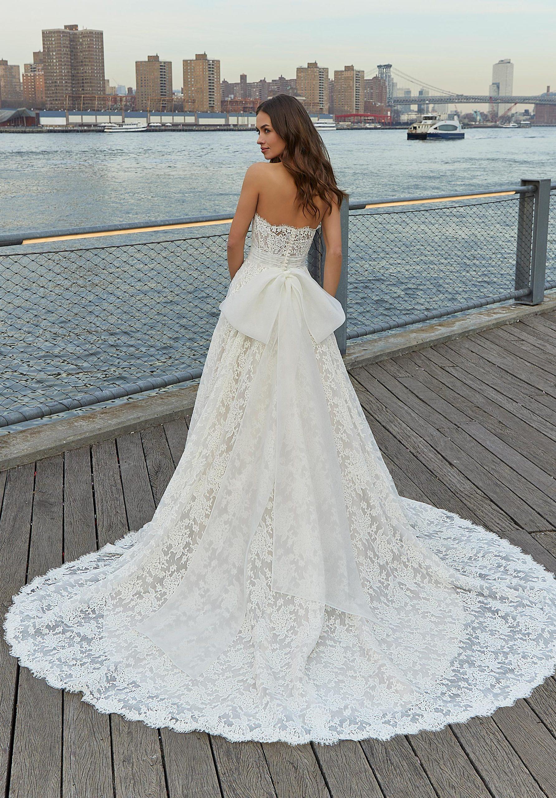 Elegant Alercon lace dress, a fine dress made of traditional lace, with Chantilly skirt ends. A straight cut with a transparent illusion provides subtlety to the model. An organza belt with a large bow accentuates the waist to highlight the figure.