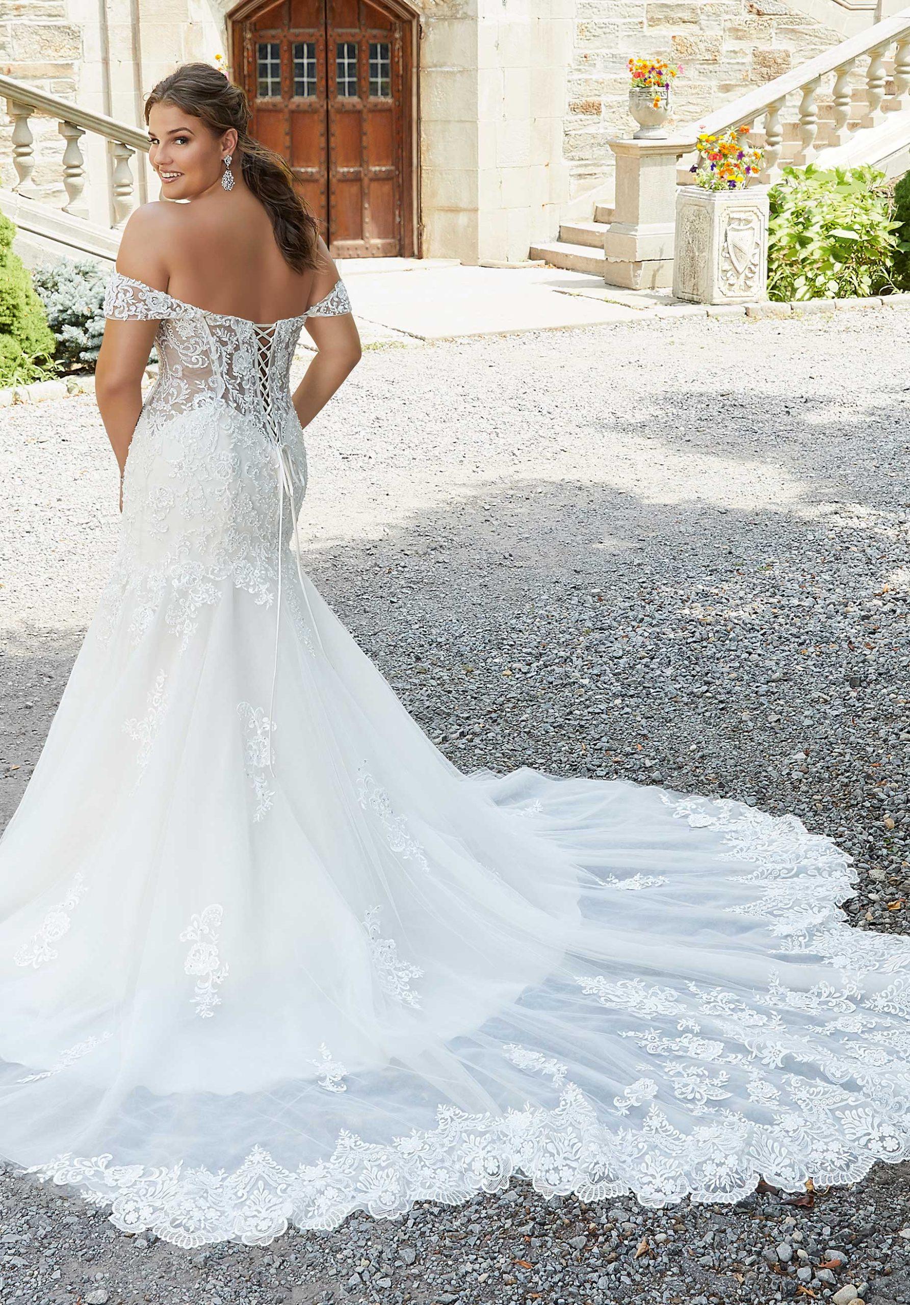 The Sophie wedding dress made of lace and tulle. Embroidered applications on glass and diamond beads embroidered on a tulle mermaid silhouette. Details include transparent and sculpted sides and back with detachable sleeves and scalloped train with lace trim. Detachable lace on net sleeves