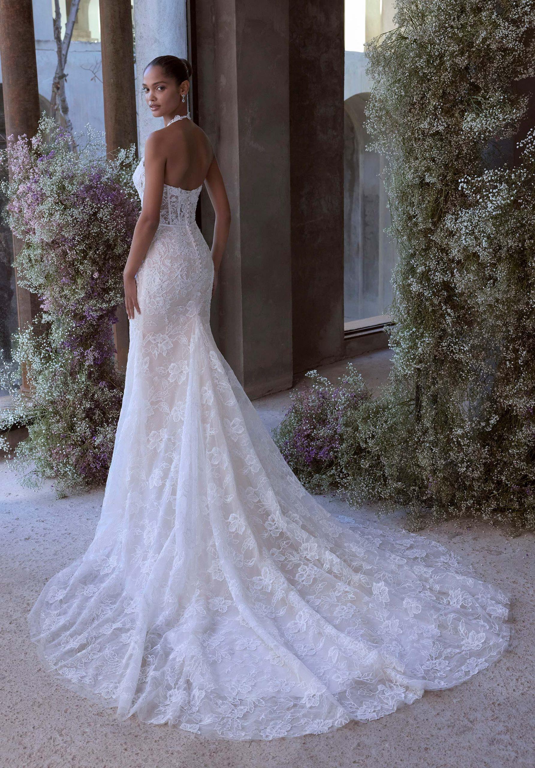 Mermaid wedding dress with exquisite and delicate lace available at our Bridal House in Santiago. A sweetheart neckline with detachable straps can give you a halter or strapless look. A long train will impress on your walk.