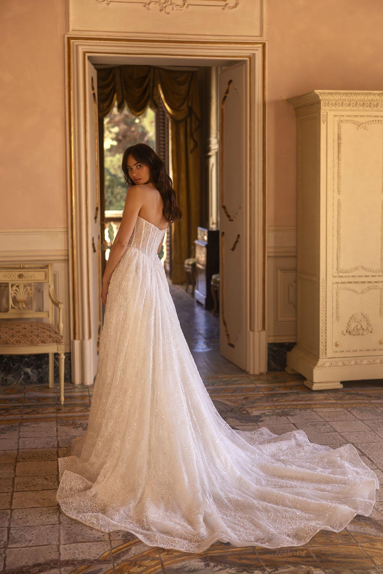 A spectacular wedding dress, with fine bead embroidery throughout the fabric. A sheer bodice with transparencies creates a corset that elongates the figure.
