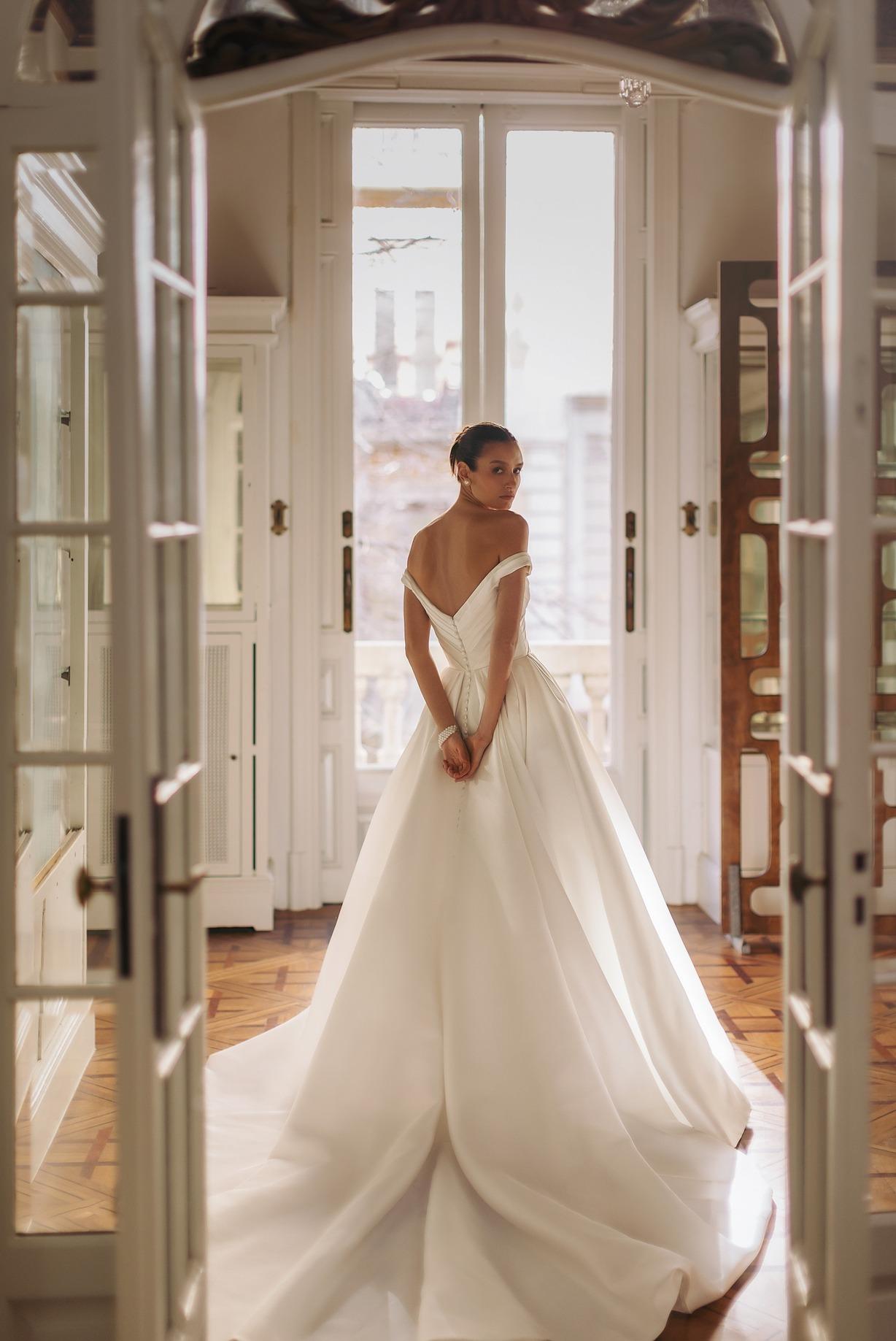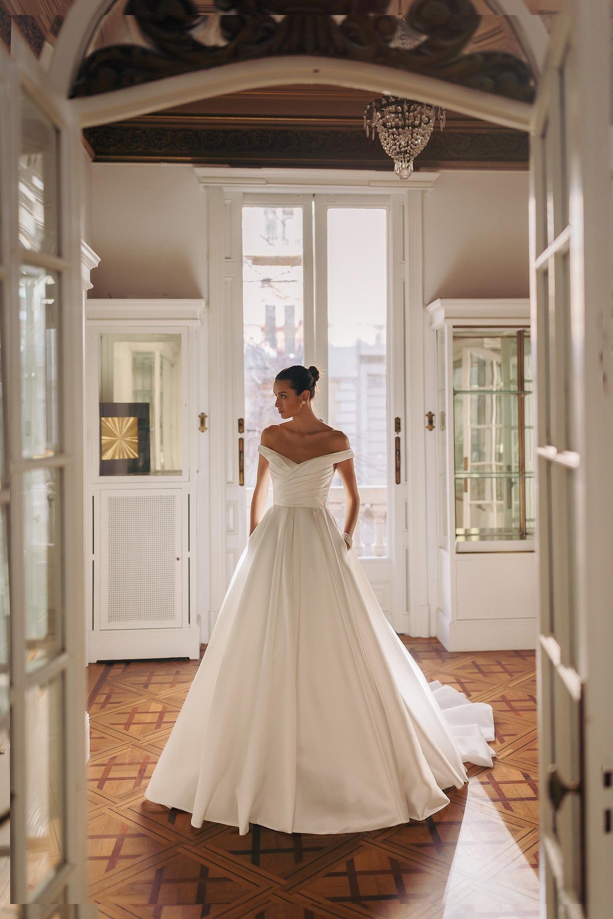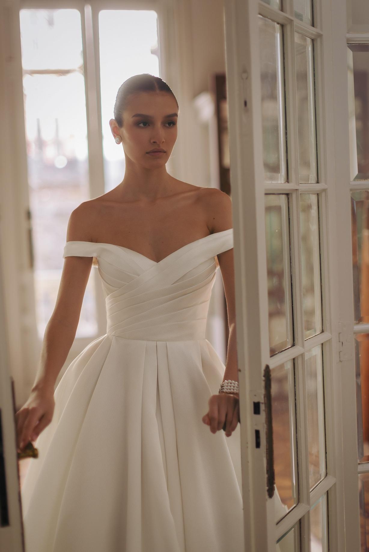 Exquisito vestido de novia en mikado pique. Una maravillosa tela con una textura especial con un color perlado. Unos hombros off shoulder caen de manera romántica. El corpiño drapeado junto a la falda de princesa tachonada muestran un vestido de novia digno de la realeza.